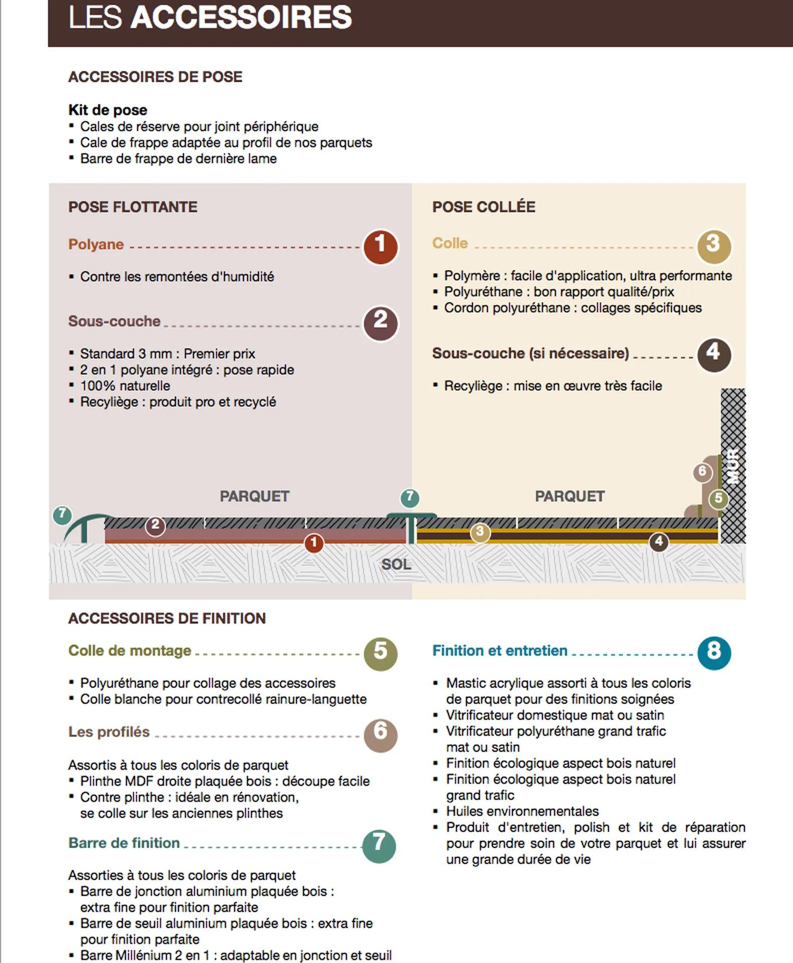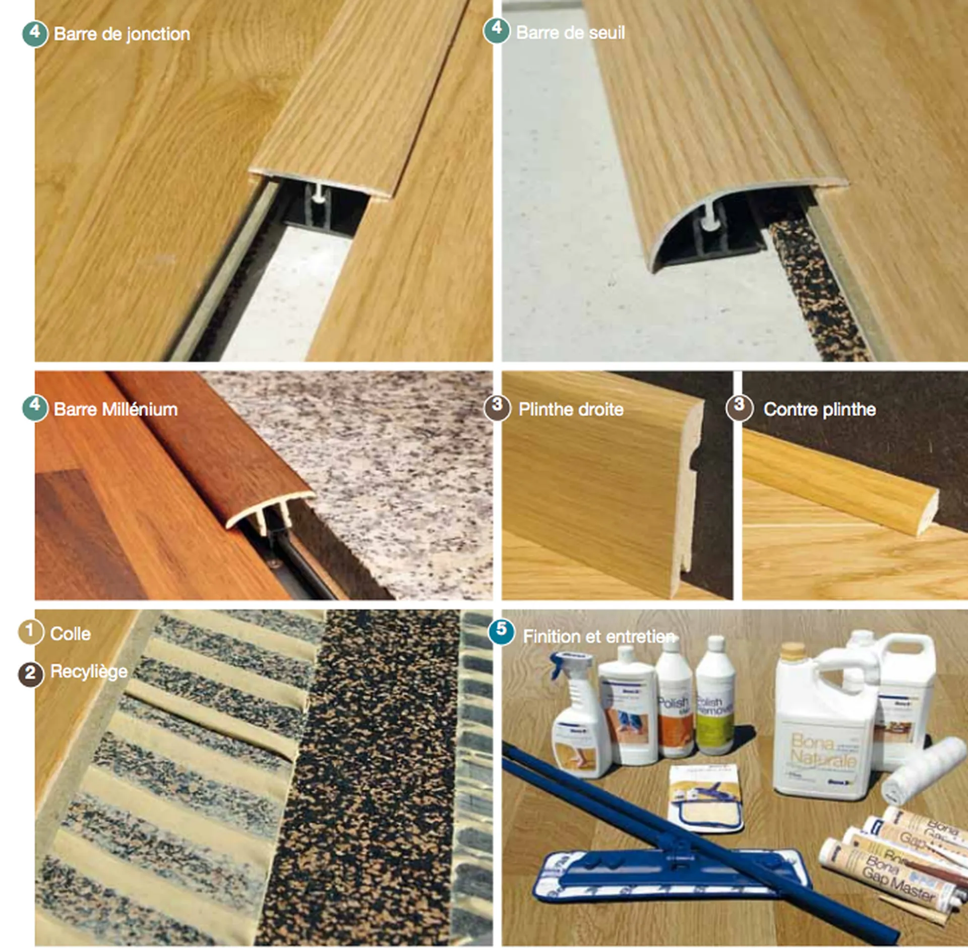 Les terrasses du bois vous proposent des accessoires de pose pour votre parquet ainsi que les accessoires pour différents types de pose pour votre plancher avec des barres de jonctions, des barres de seuils, des barres milleniums, des plinthes massives et plinthes en mdf, des contres plinthes...