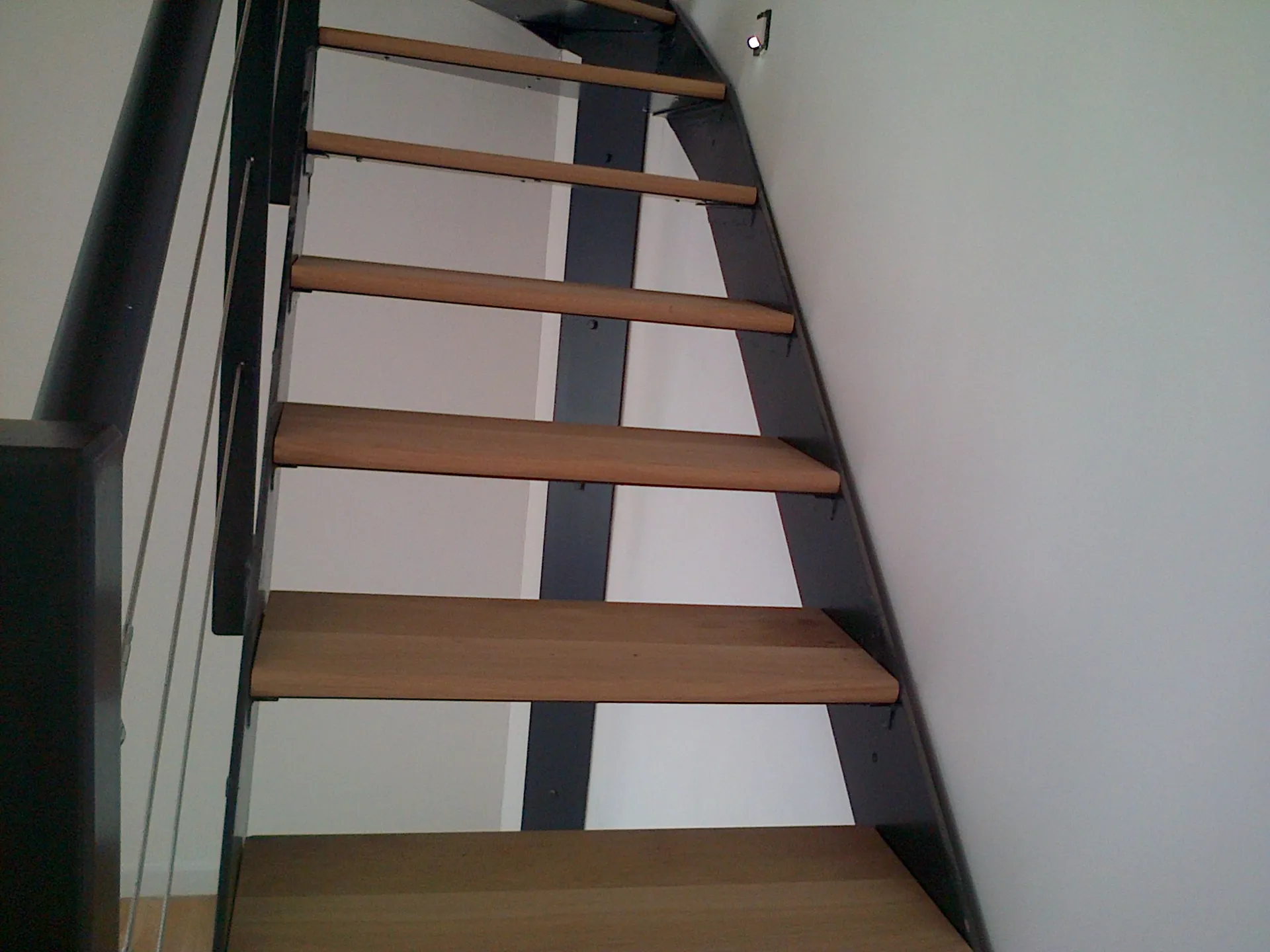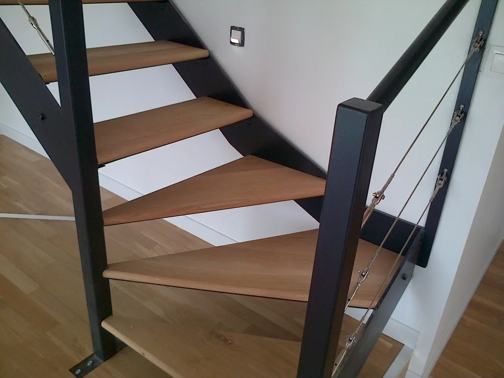 Agencement d'un escalier en chêne brut de 30 mm qui permet une stabilité des marches.