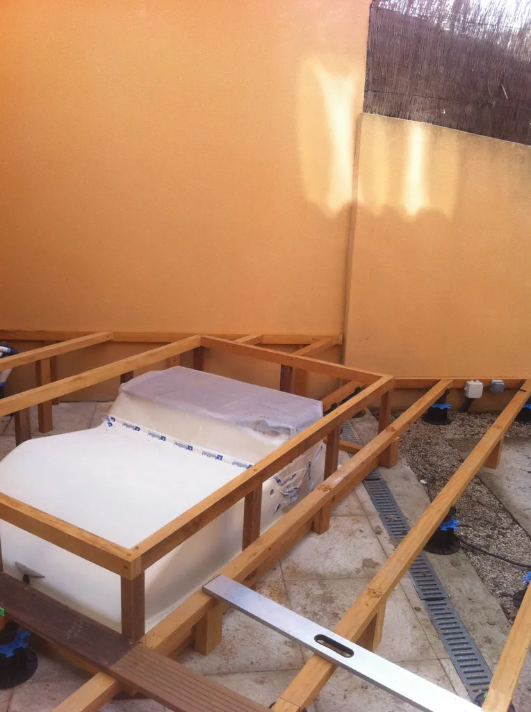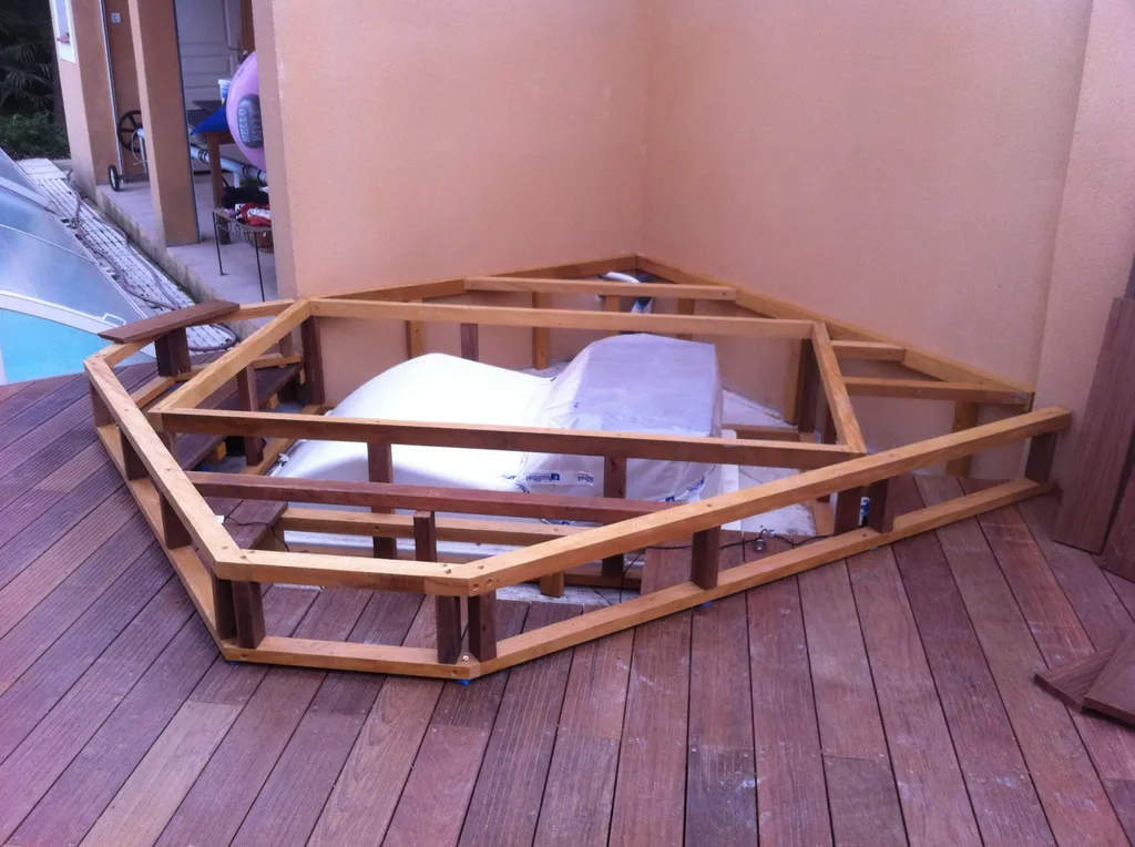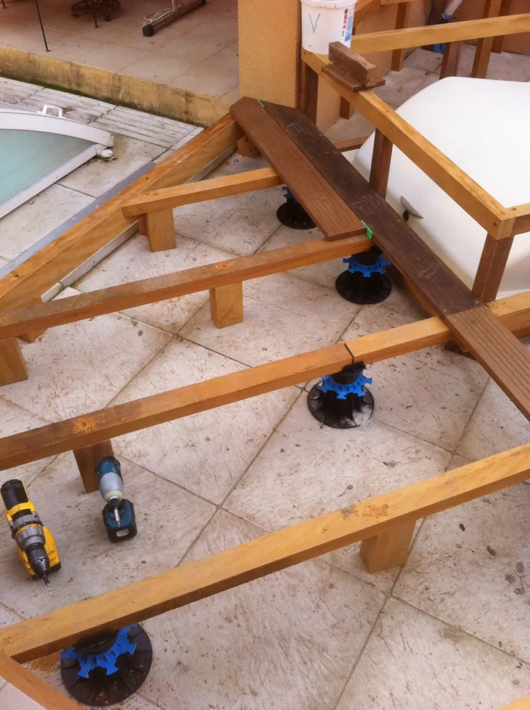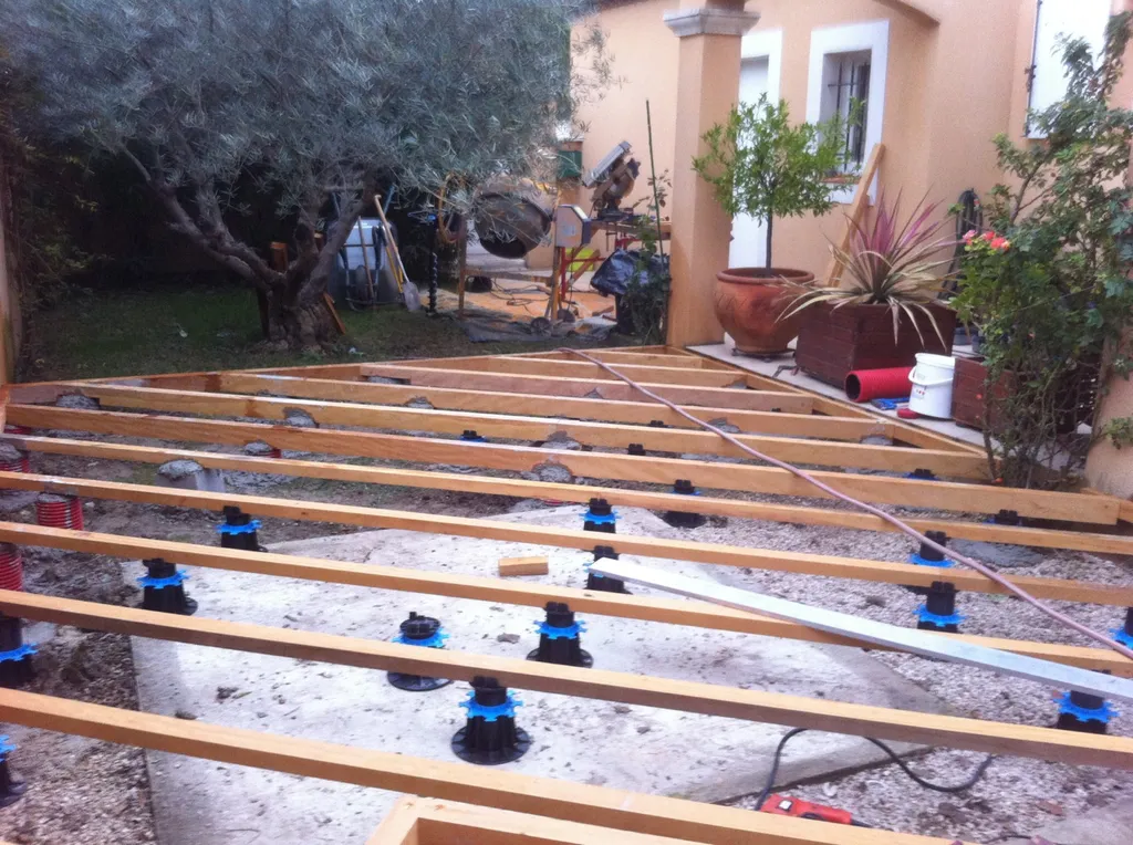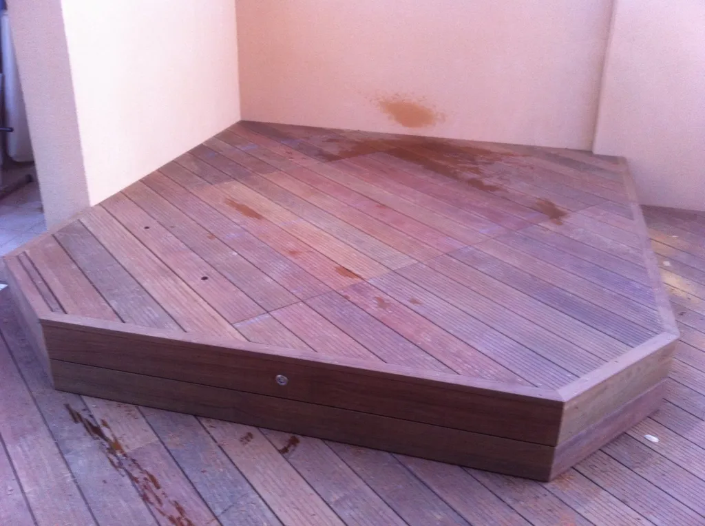 La technique de pose est plots béton et plots réglables, ainsi qu'une structure en bois exotique badi. Le bois , un matériau naturel , esthétique et noble.