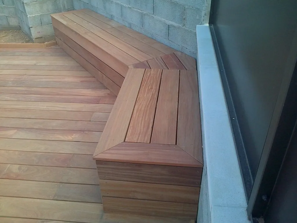 Banc de rangement pour tours de piscine en bois exotique CUMARU à Lançons de Provence dans les bouches du Rhône.