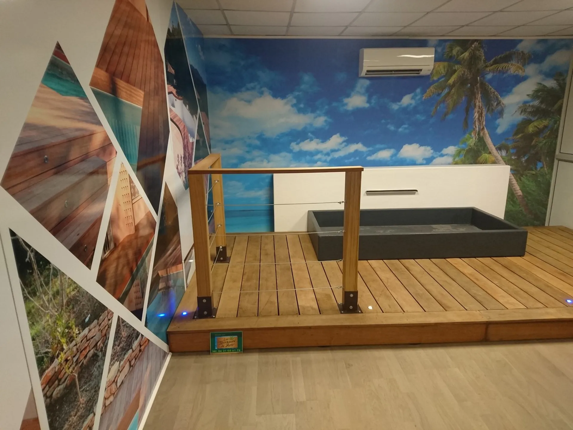Ce garde corps bois exotique et cable inox sur mesure crée par Les Terrasses du Bois vous ai proposé dans notre showroom de plan de campagne .