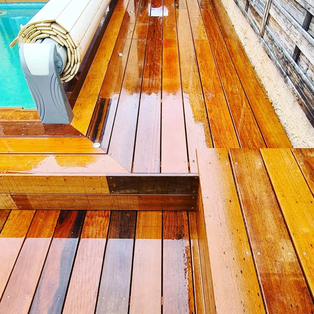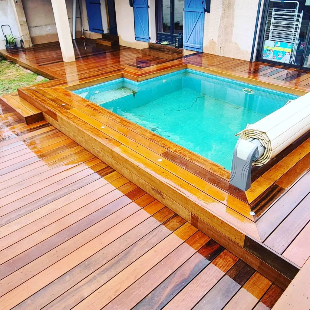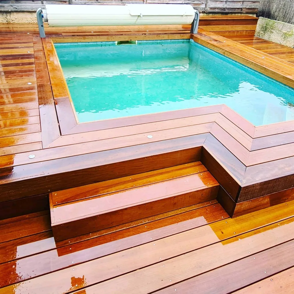 Installation d'un tour de piscine en itauba avec différents niveaux .
