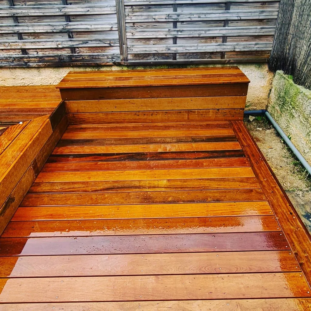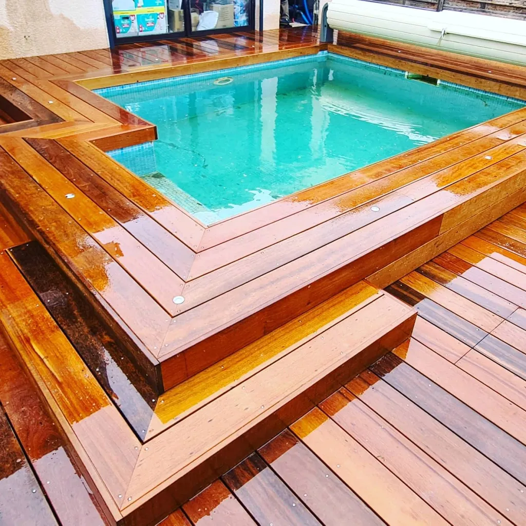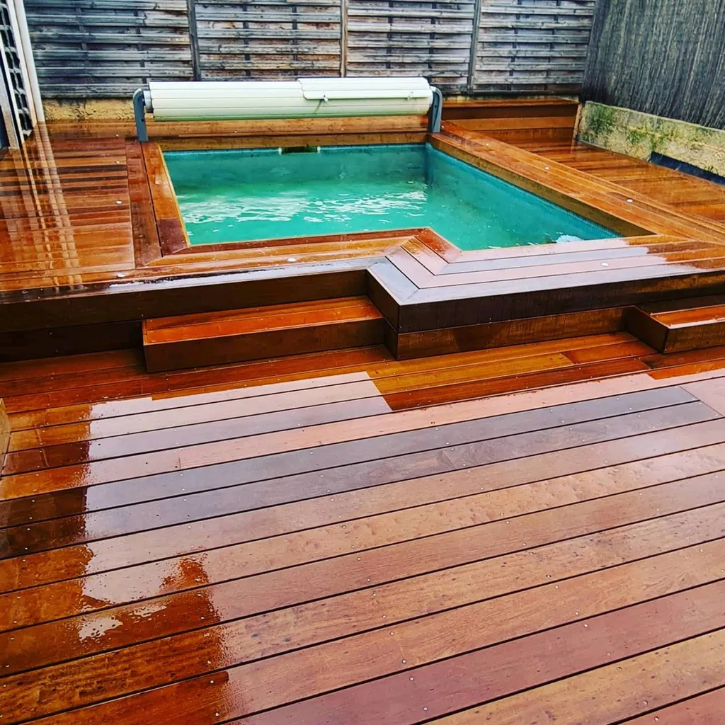 Installation d'un tour de piscine en itauba avec différents niveaux .