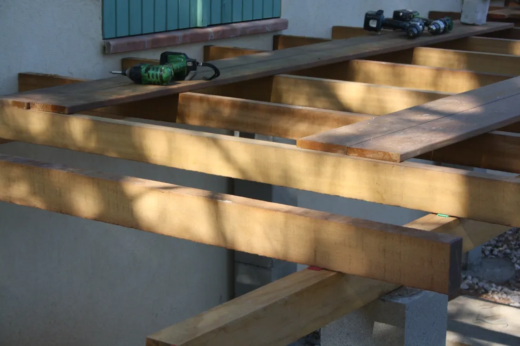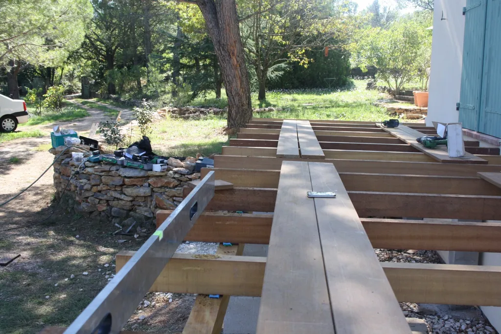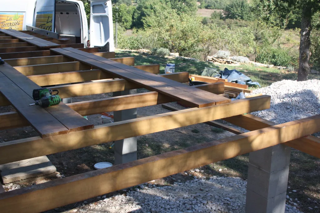 L'utilisation de lambourdes en bois exotiques pour soutenir la structure de la terrasse est également mentionnée. Les lambourdes sont des poutres ou des pièces de bois utilisées pour soutenir les lames de la terrasse et assurer une base solide. L'utilisation de bois exotiques pour les lambourdes est cohérente avec le choix d'utiliser l'IPE comme matériau principal de la terrasse, ce qui assure une harmonie esthétique et une cohérence dans les caractéristiques du bois utilisé.