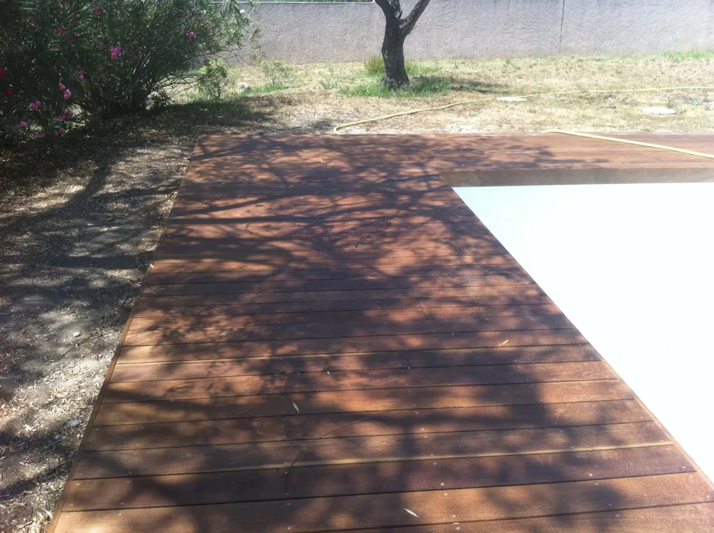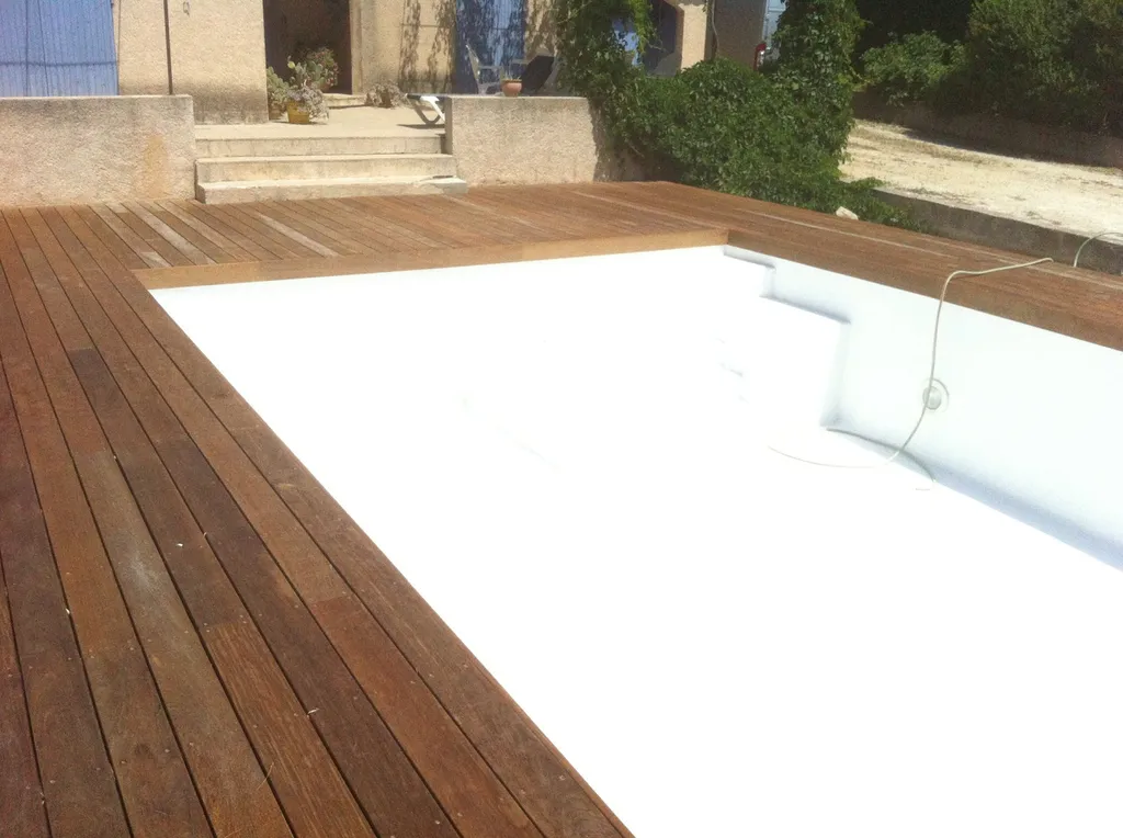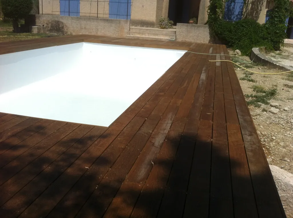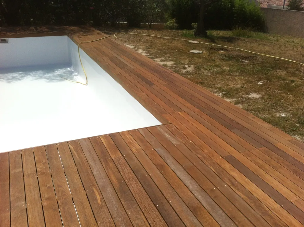Tour de piscine en bois exotique Ipé à La Fare les Oliviers(13) avec une technique de pose sur plots et lambourdes.