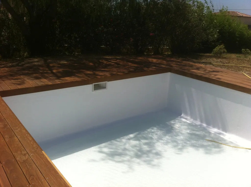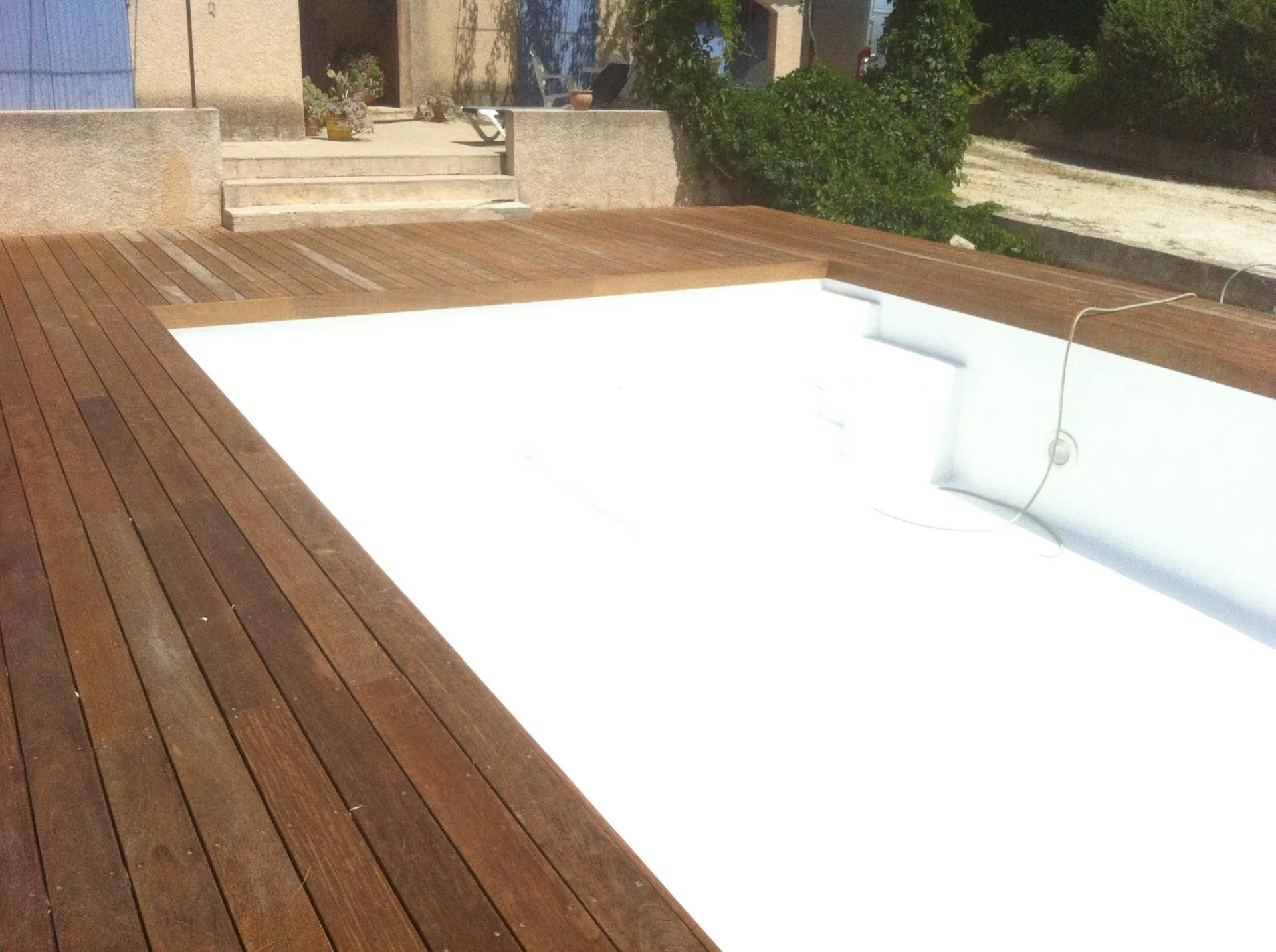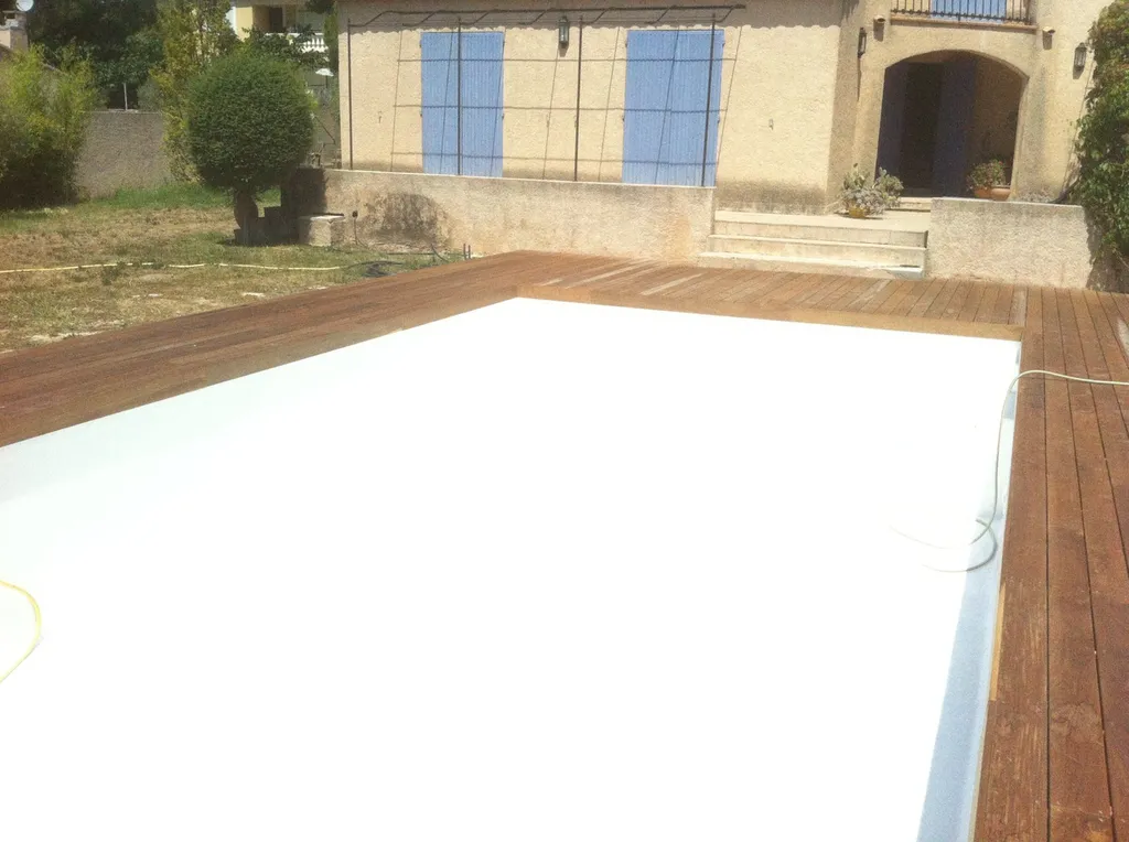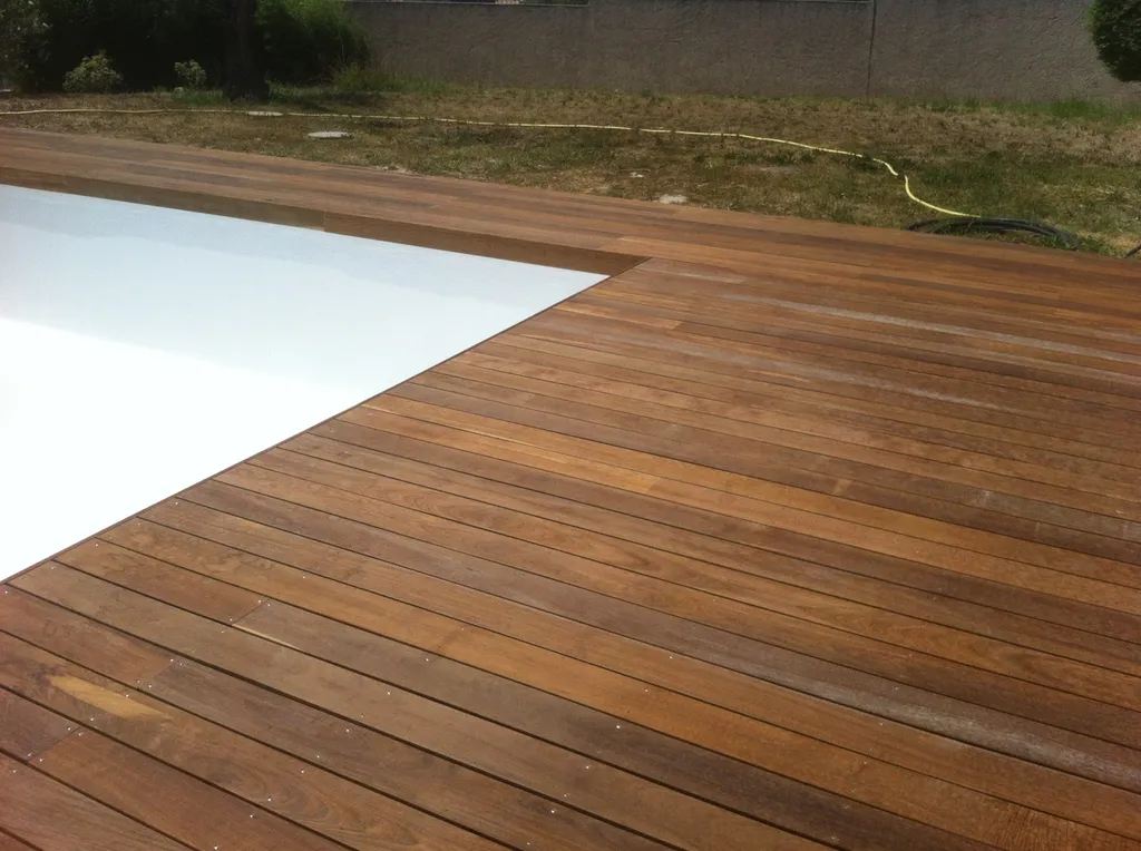 Tour de piscine en bois exotique Ipé à La Fare les Oliviers(13) avec une technique de pose sur plots et lambourdes.
