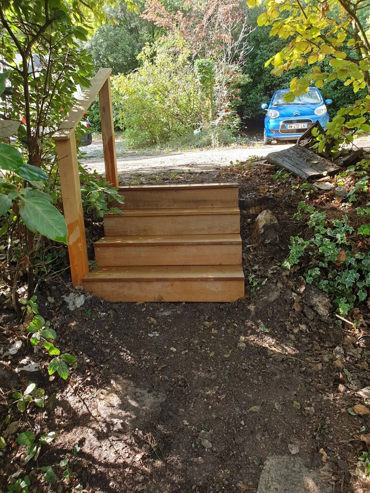 Réalisé grâce à des limons de 4 marches. Une main courante à également était ajoutée.
