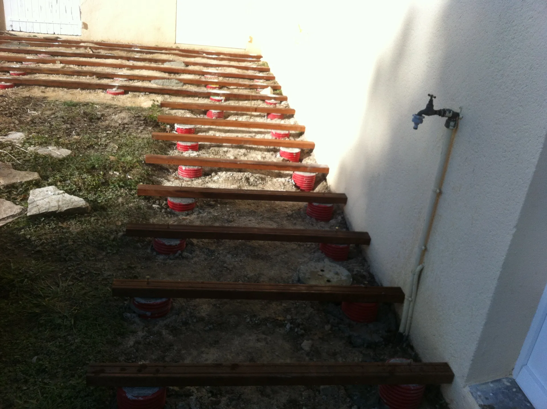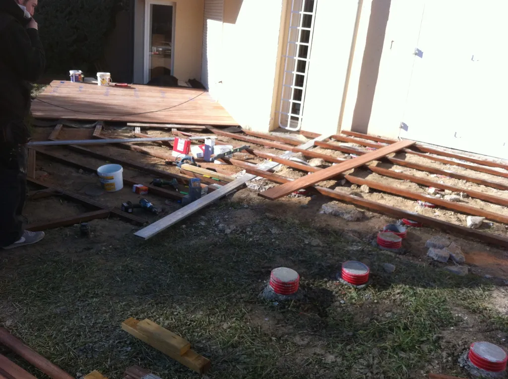 Les terrasses du bois ont réalisé cette terrasse en bois exotique Cumaru sur plots en béton. Cette terrasse est posée sur des lambourdes en bois exotique Angelhim. Le platelage en Cumaru est ensuite fixé avec des vis inox A2.