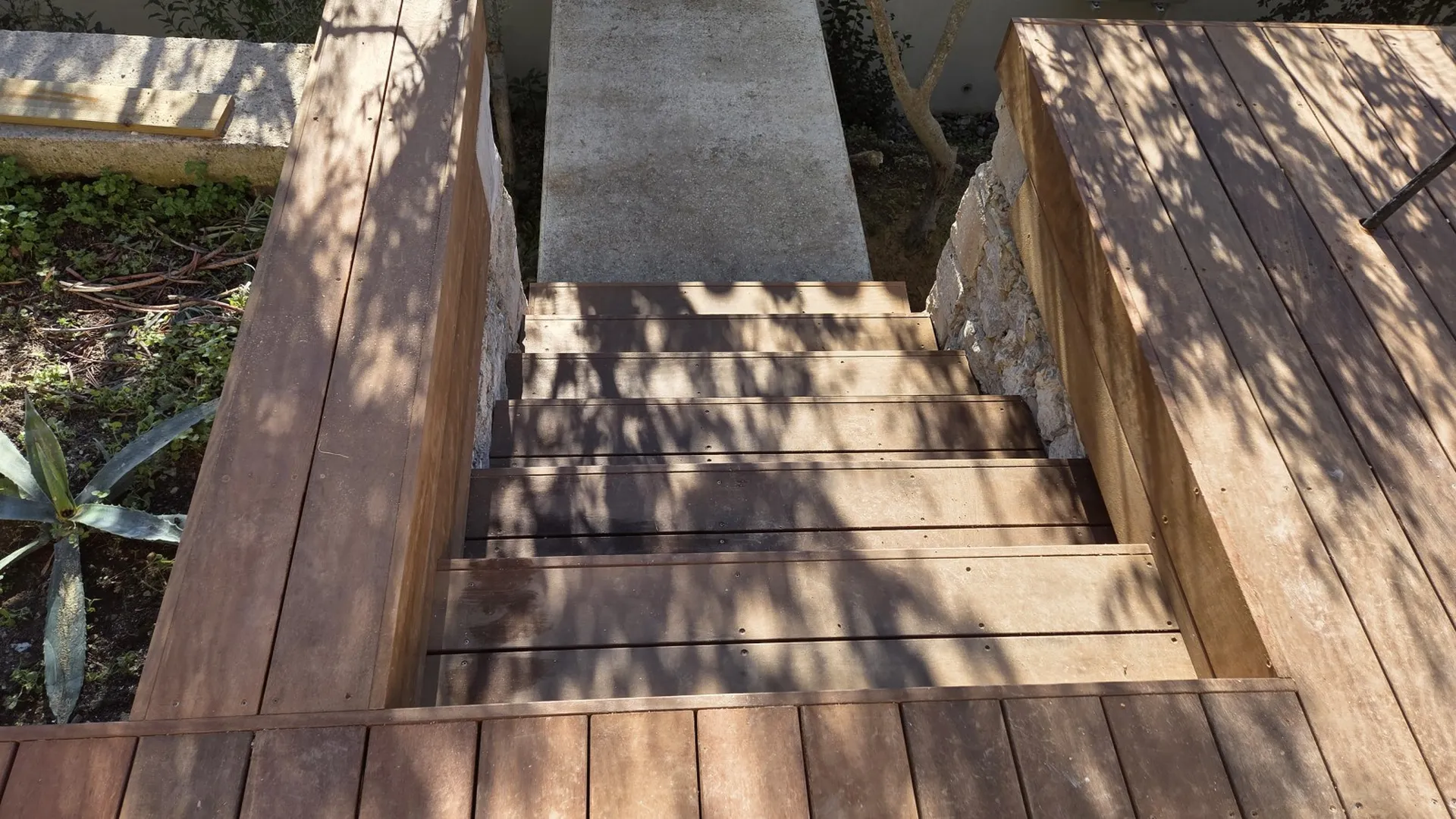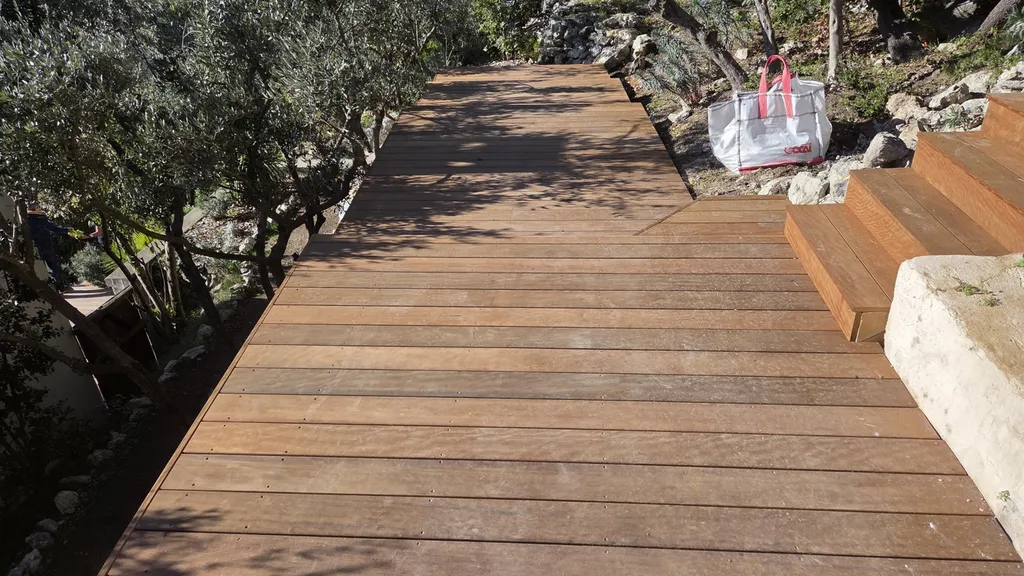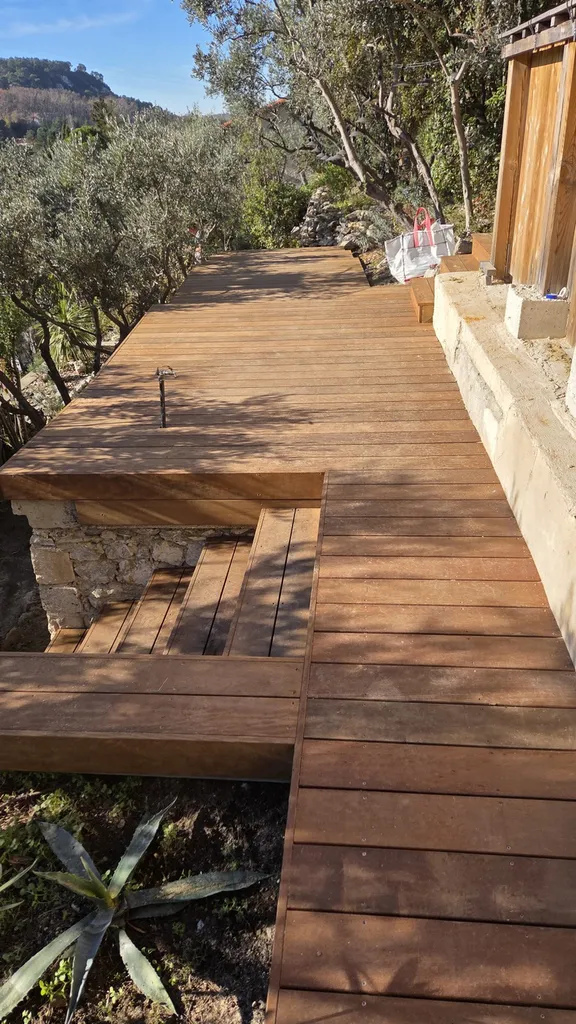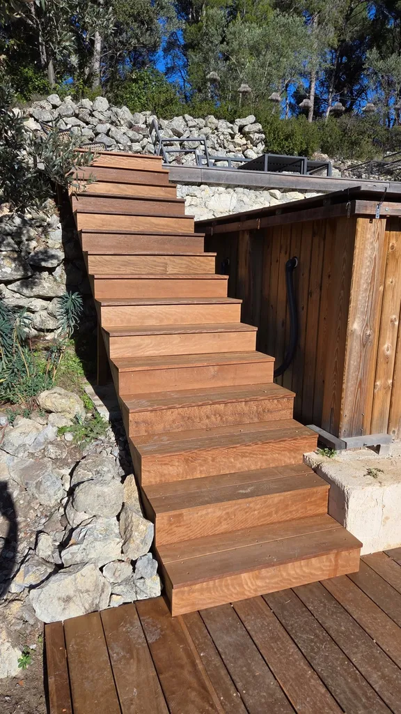 Nous avons réalisé une terrasse chaleureuse et durable en bois exotique. L’objectif consistait à aménager un espace extérieur confortable, avec un accès facilité par deux escaliers, tout en utilisant un bois haut de gamme, résistant aux intempéries.