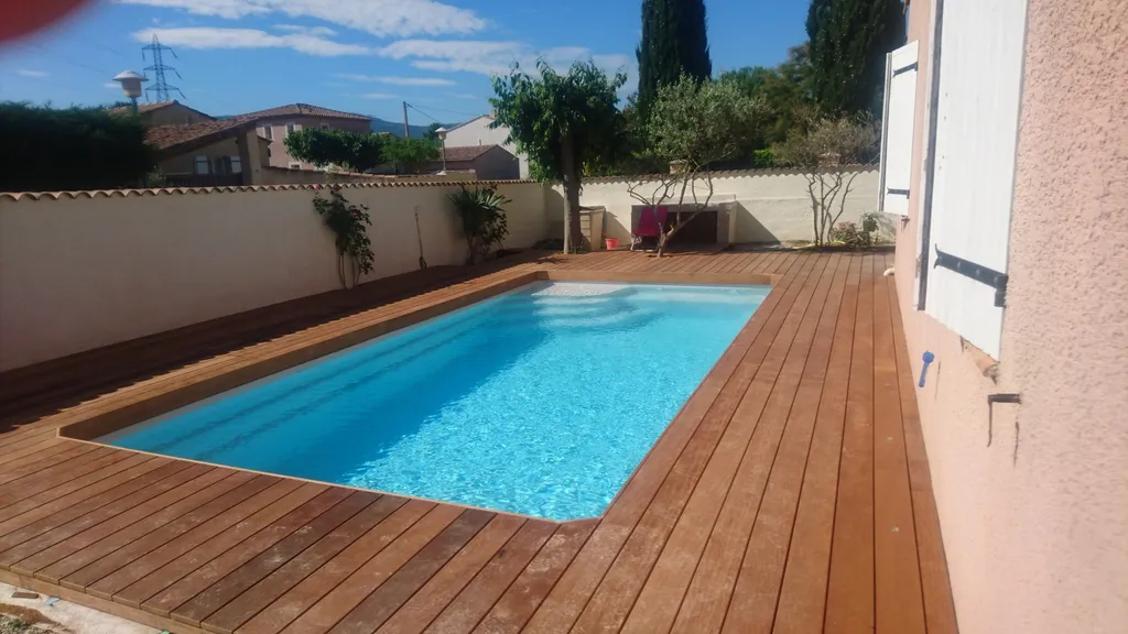Tour d'une piscine bois en bois exotique Itauba sur plots bétons à Gardanne