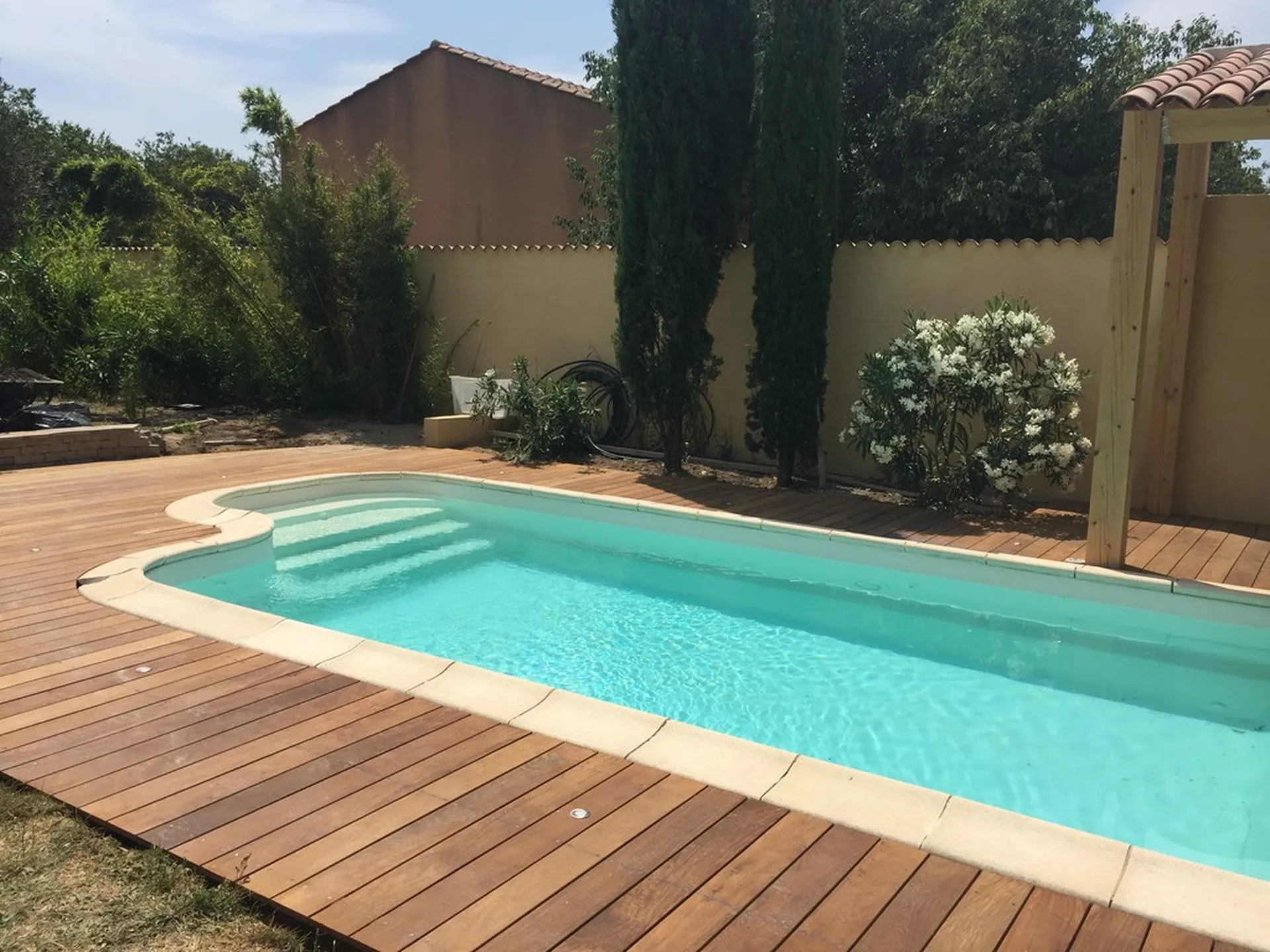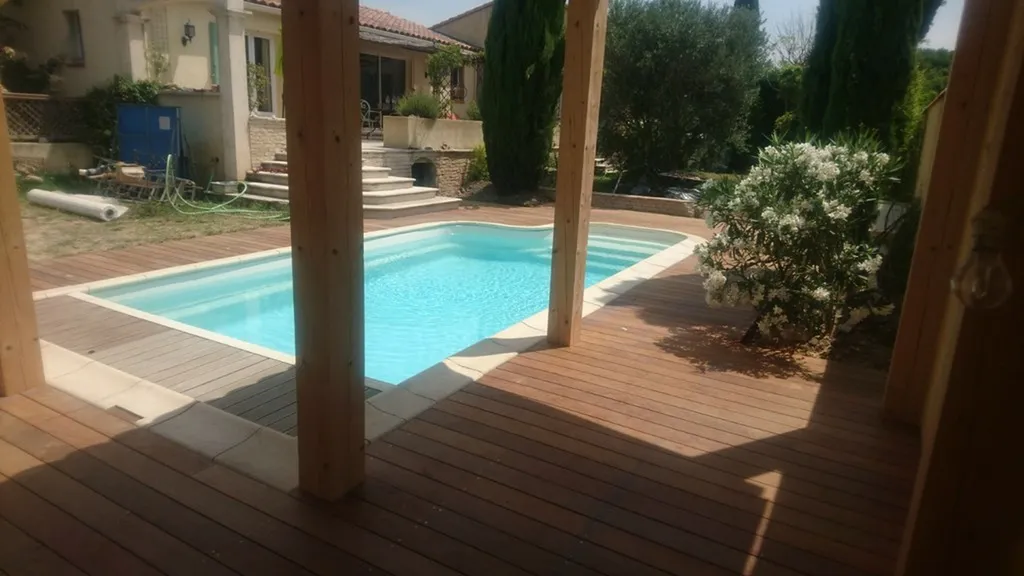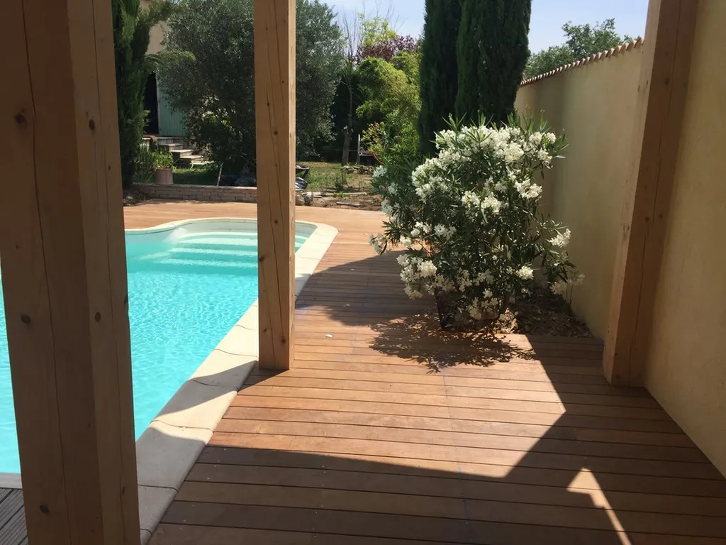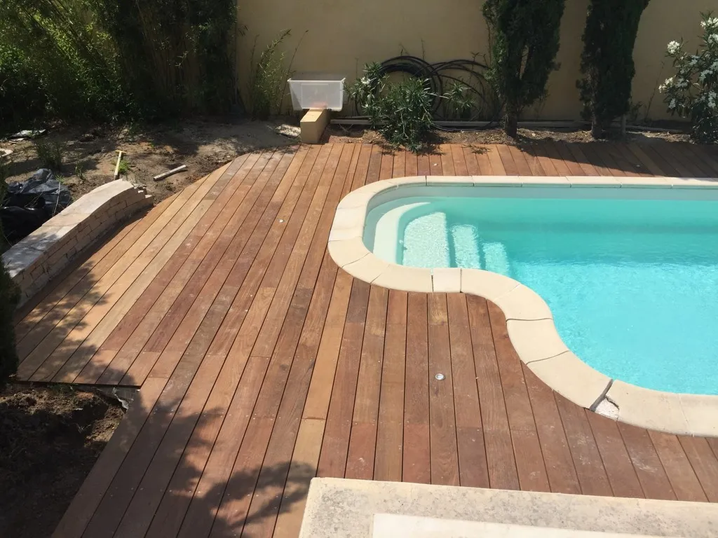 A St Cannat ce magnifique tour de piscine en bois exotique IPE structure posée sur plots béton. Les lames d'IPE arrivent au ras des margelles