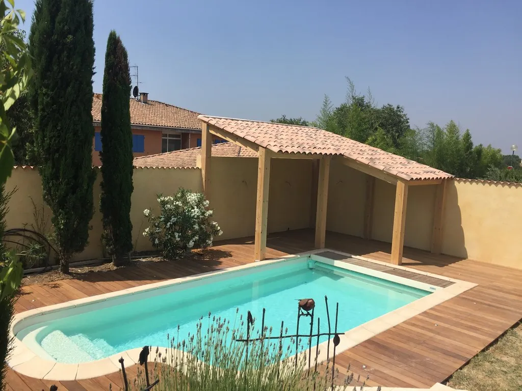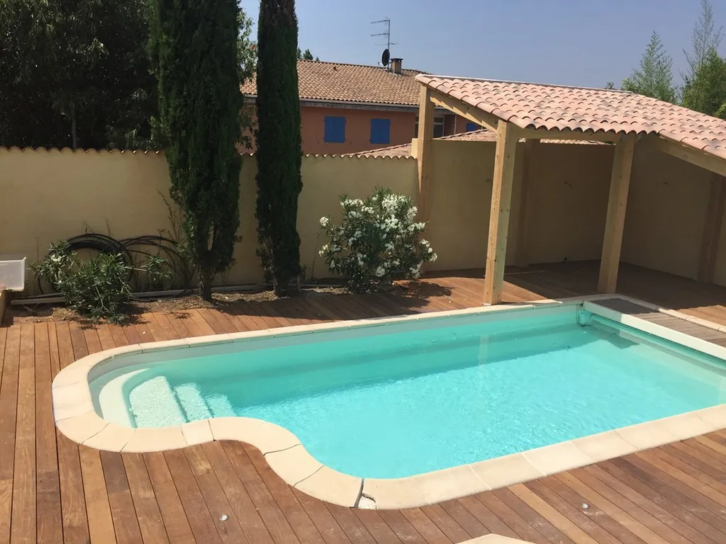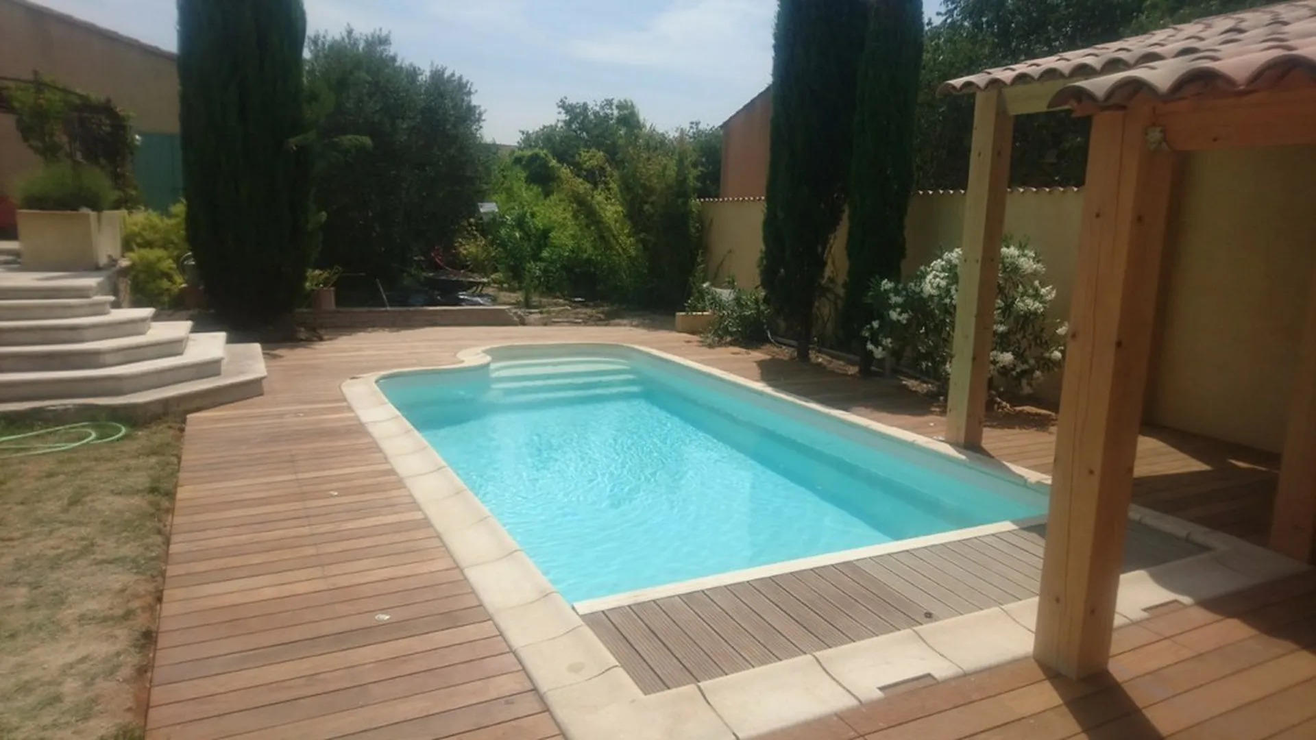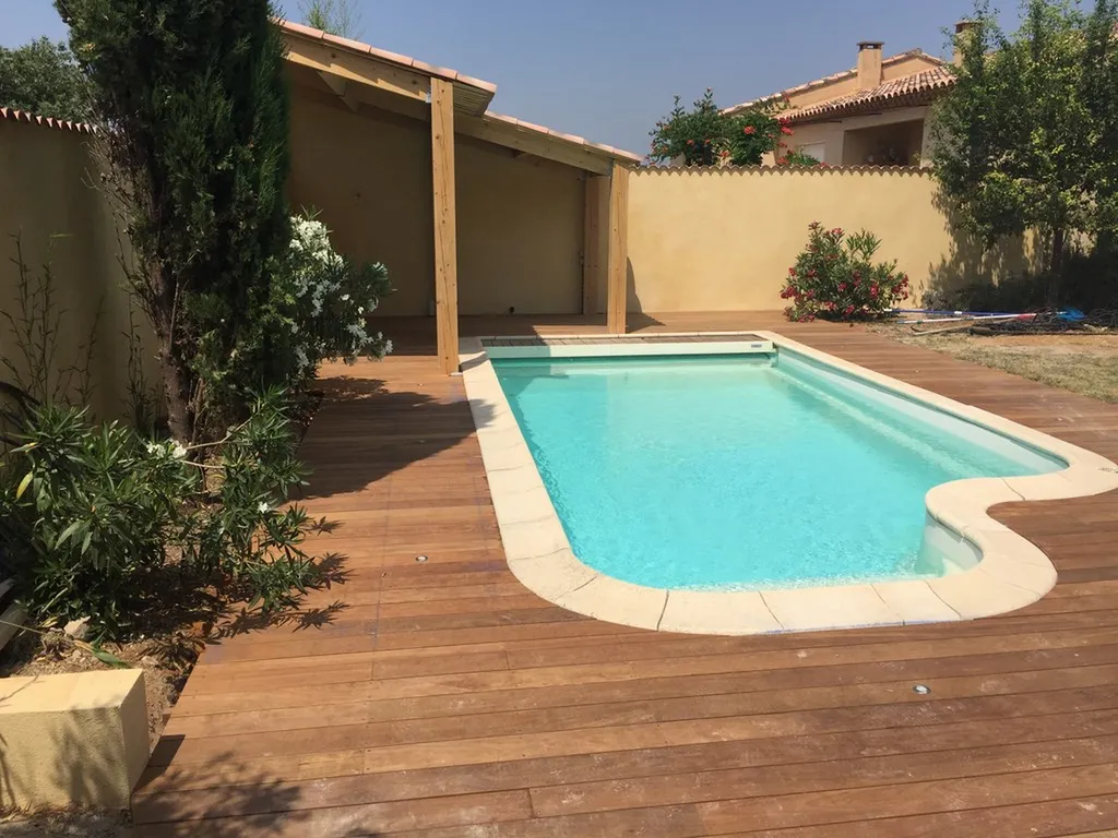 A St Cannat ce magnifique tour de piscine en bois exotique IPE structure posée sur plots béton. Les lames d'IPE arrivent au ras des margelles