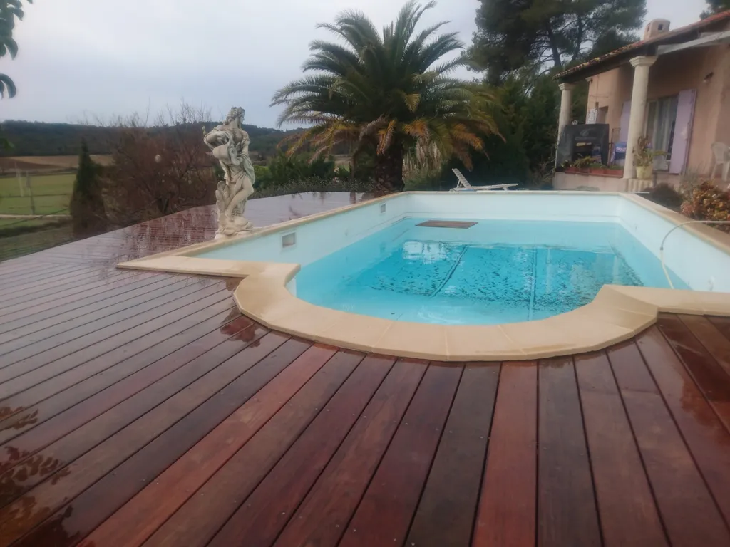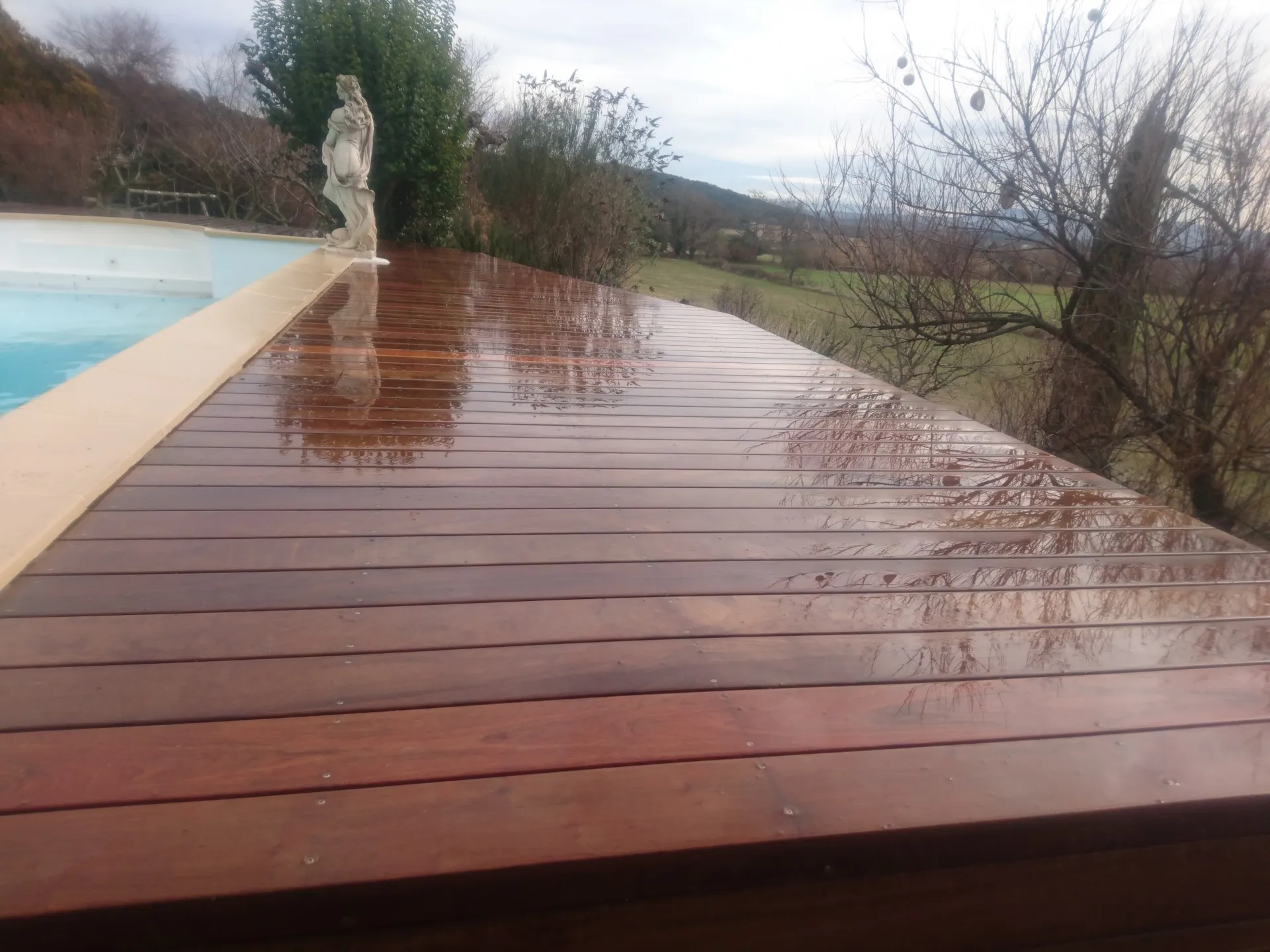 Tour de piscine en IPE avec une technique de pose sur lambourdes avec structure en hauteur.