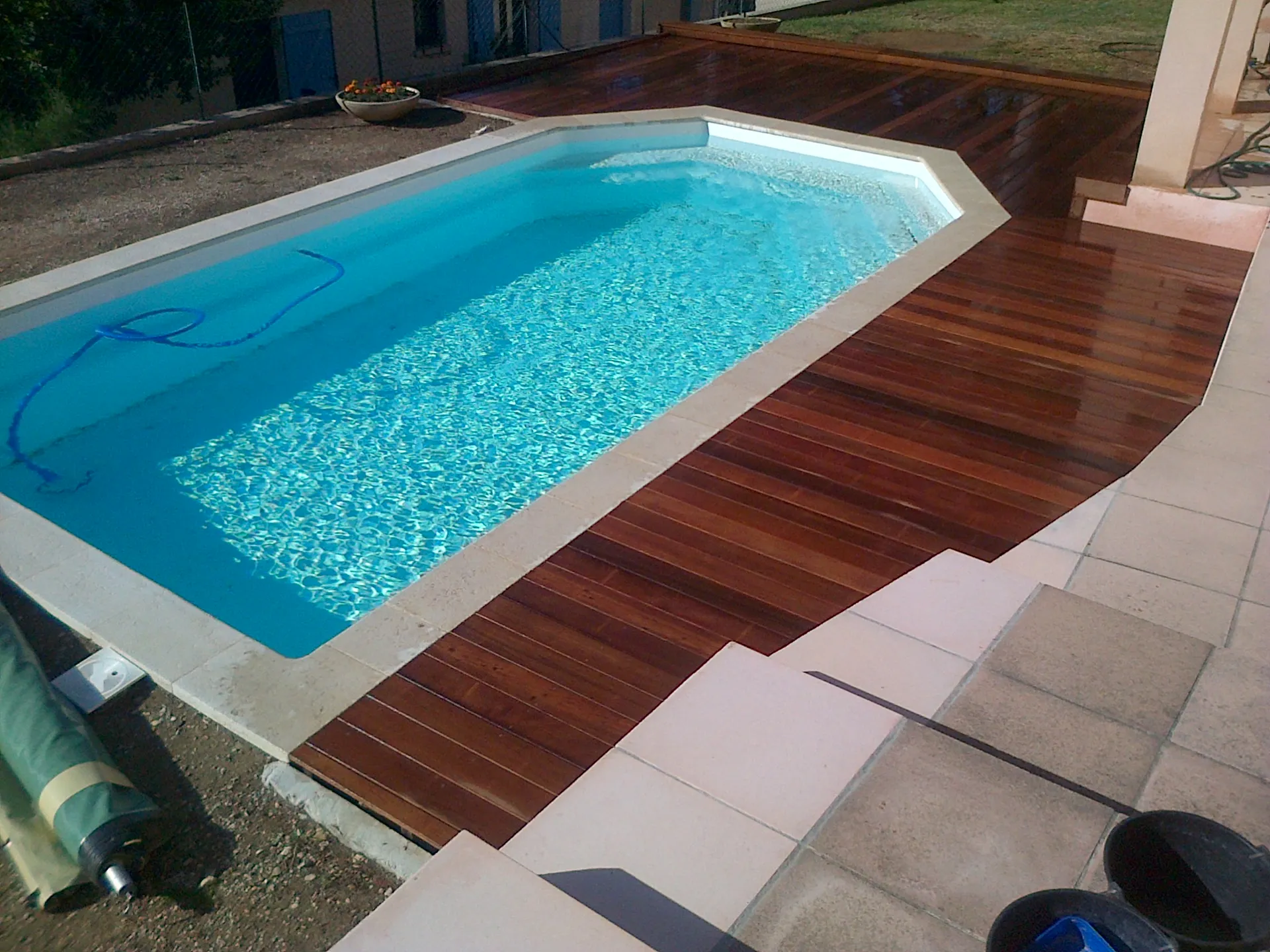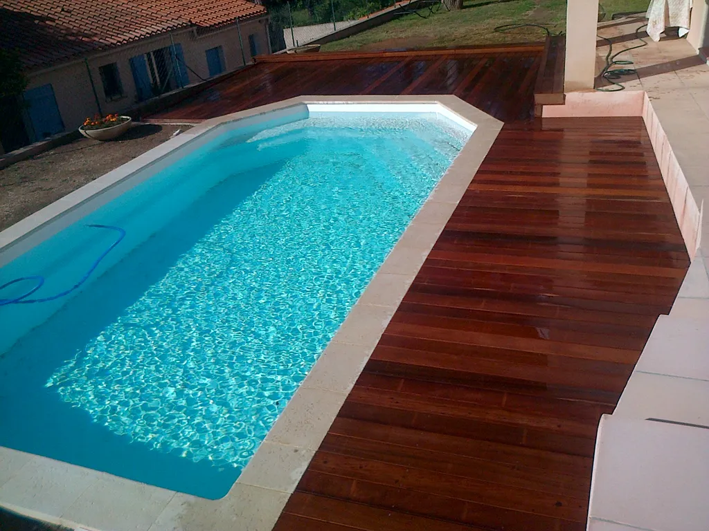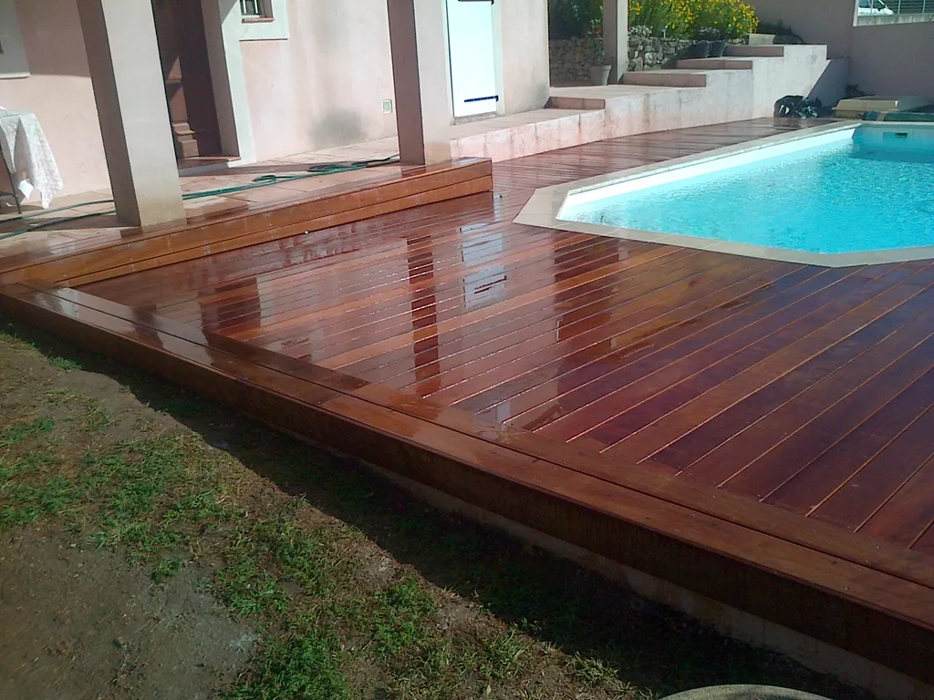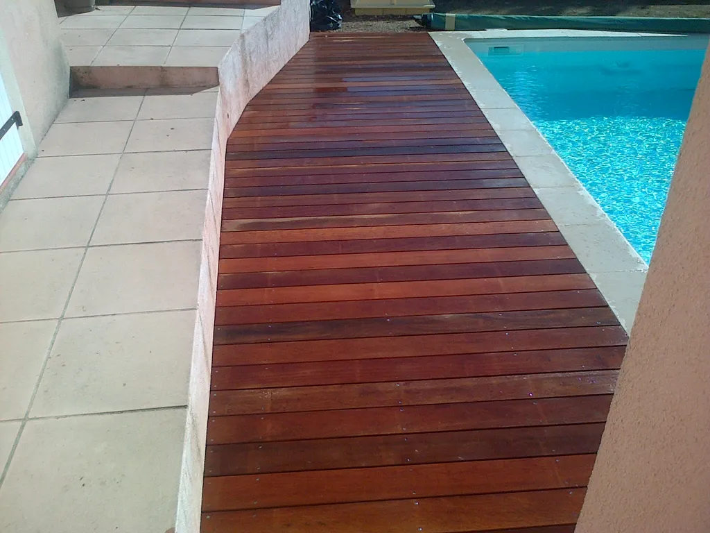 Tour de piscine en bois exotique Itauba à Ensues la redonne (13) avec une technique de pose sur lambourdes en bois exotique .