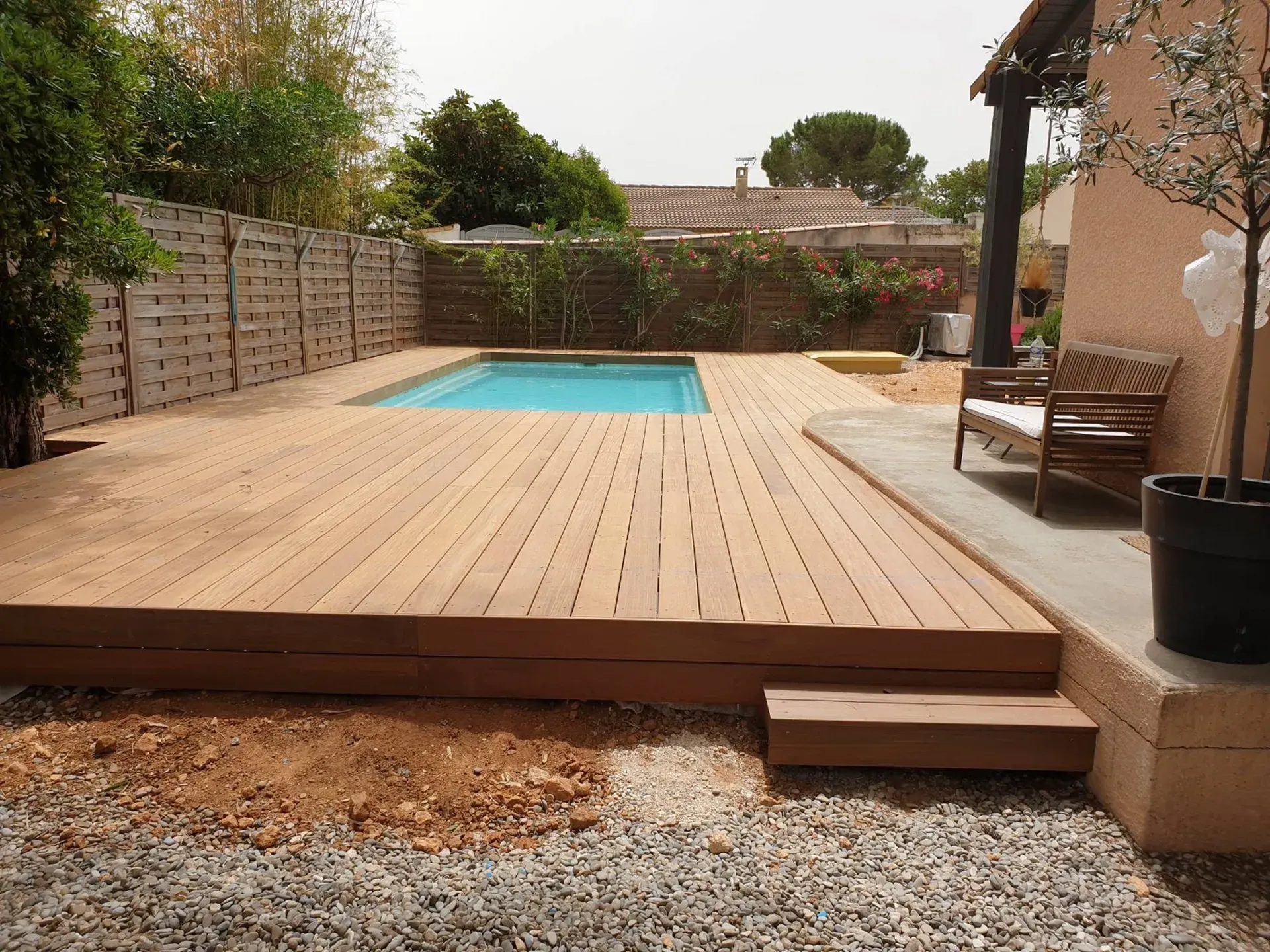 L'utilisation de lambourdes en bois exotiques pour soutenir la structure de la terrasse est également mentionnée. Les lambourdes sont des poutres ou des pièces de bois utilisées pour soutenir les lames de la terrasse et assurer une base solide. L'utilisation de bois exotiques pour les lambourdes est cohérente avec le choix d'utiliser l'IPE comme matériau principal de la terrasse, ce qui assure une harmonie esthétique et une cohérence dans les caractéristiques du bois utilisé.